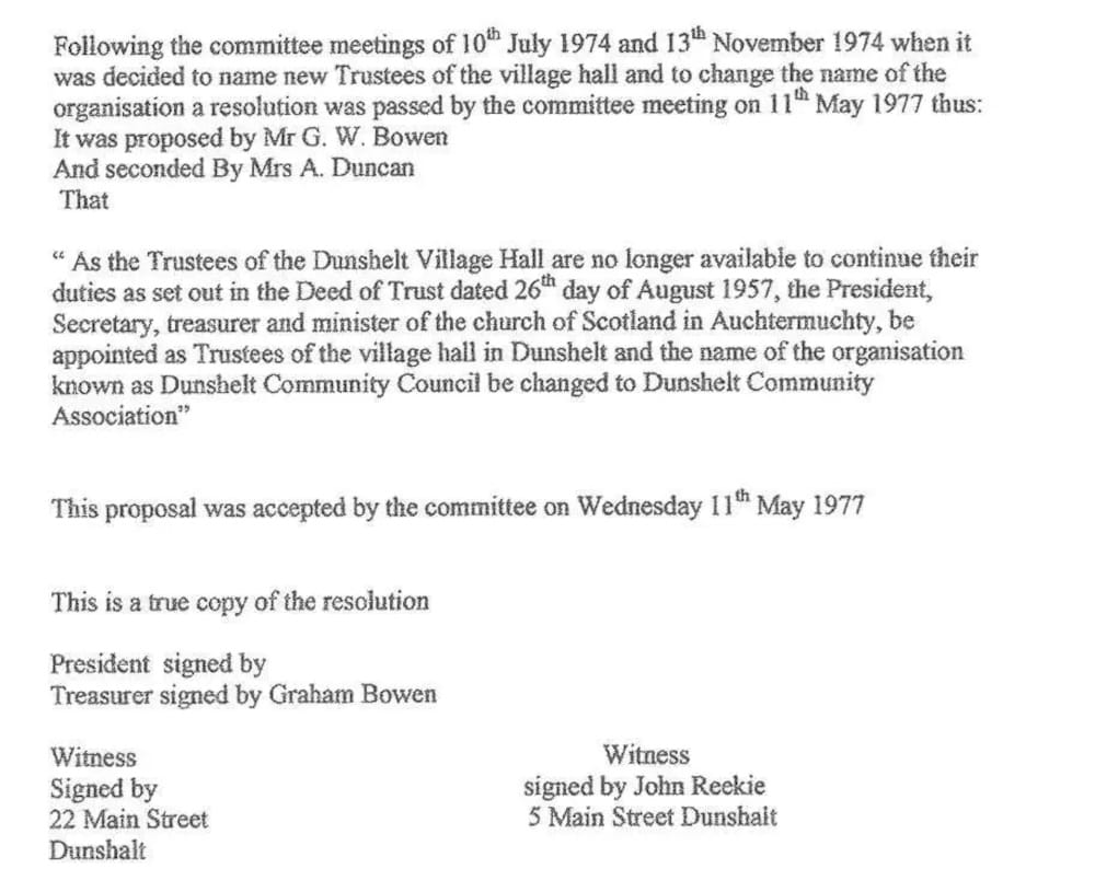 The Association was formed in 1977, the Trustees of the Village Hall no longer being able to carry out their duties. The Dunshelt Community Council was renamed Dunshelt Community Association, and this new body took over the responsibility for managing and maintaining the Hall for the benefit of the village. 1n 2024 the Association changed its legal status to become a SCIO (Scottish Charitable Incorporated Organisation) with a new, updated Constitution.Â