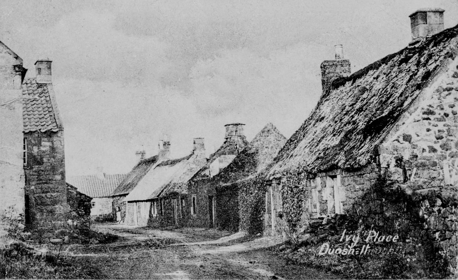 By 1895 the Valuation Roll records only two remaining small weavers, seven shops and the ever present Duncan’s Blacksmith. By 1905 the linen mill had been taken over by the much larger Erskine Beveridge & Co Ltd, Dunfermline, and areas of the village (Ivy Place photo, above) were already in serious decline.